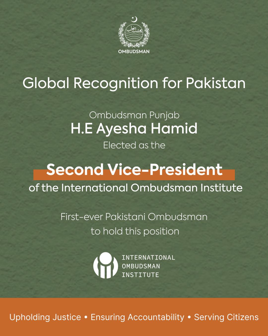 Lahore, Pakistan – The Office of the Ombudsman Punjab proudly announced that Honourable Ombudsman Punjab, Ms. Ayesha Hamid, has been elected as the first-ever Pakistani Ombudsman to hold the position…
