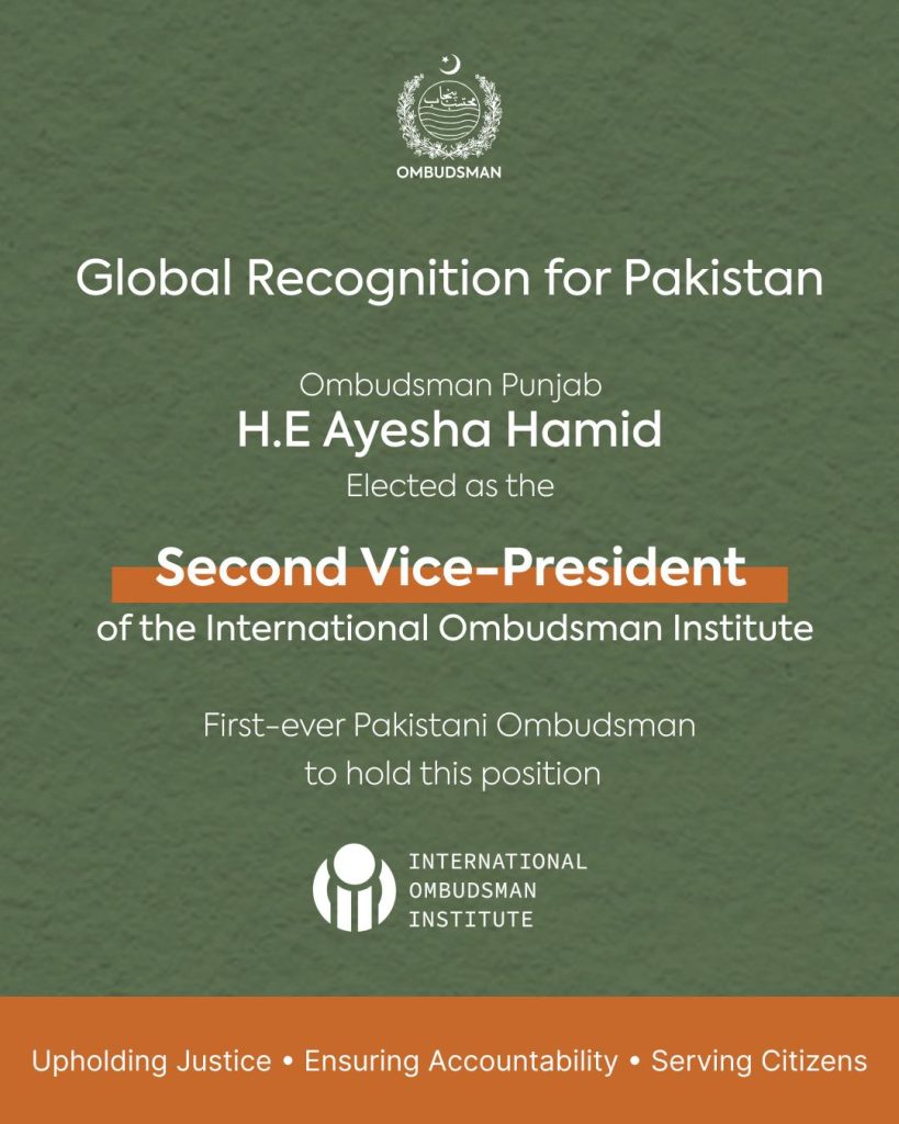 The appointment of Ms. Hamid marks a significant milestone in Pakistan’s governance journey, bringing international recognition to the institution of the Ombudsman and reaffirming its vital role in strengthening public service delivery.
